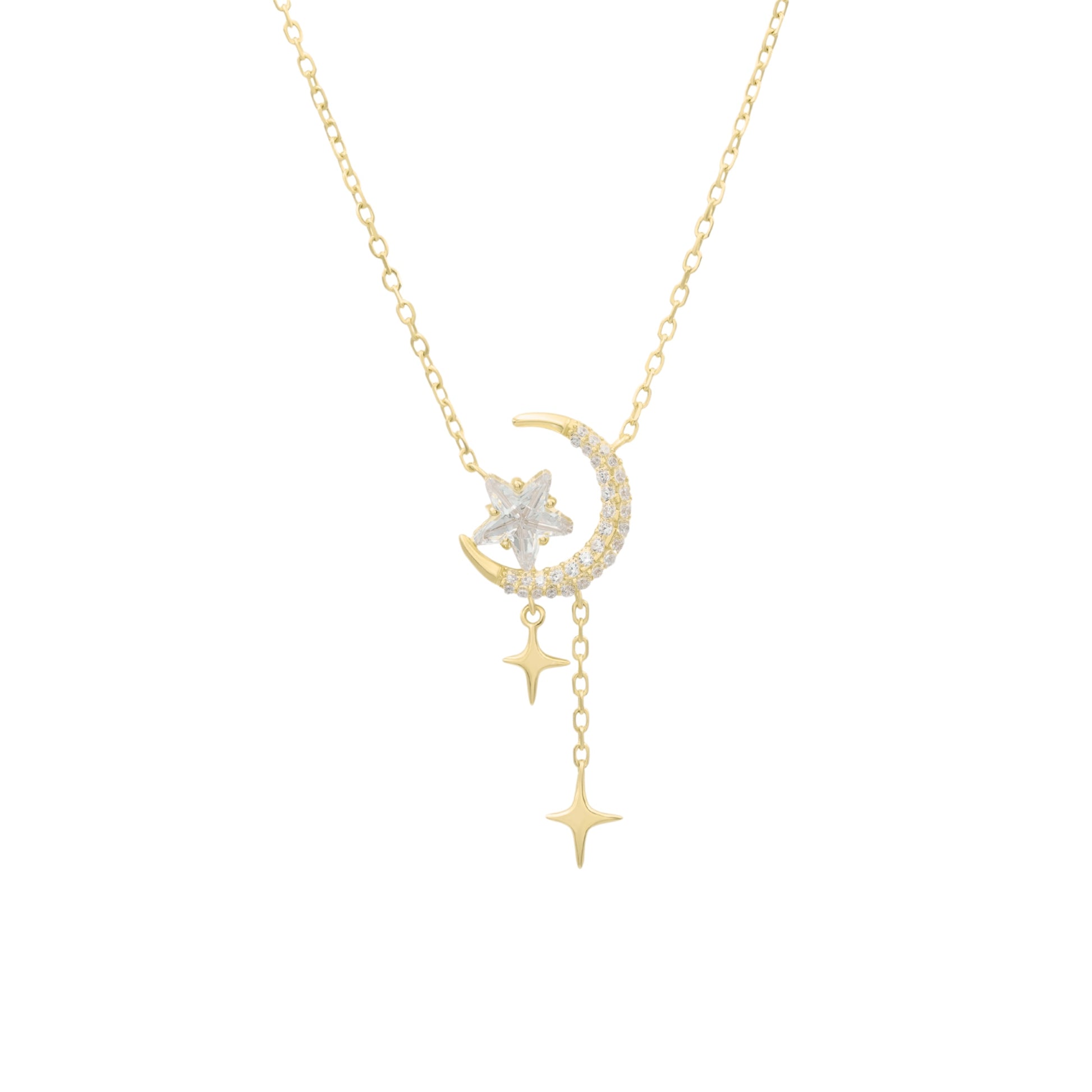 Lunafleur is a dreamy dance of crescent glow and starlit sparkle. A delicate star blossom rests against a golden moon, with two twinkling stars trailing below like whispered secrets. Crafted in gold vermeil and kissed with cosmic charm, this bracelet invites you to express your own constellation.